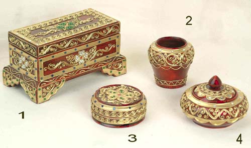 1 set of wooden boxes in red and gold laquerware. These boxes all fit inside each other and have hindged lids but no locking mechanism.