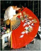 An artist at work handpainting a beautiful wall fan.All our folding