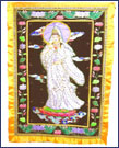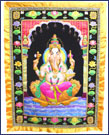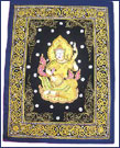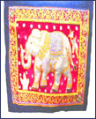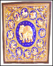Padded elephant embroidered tapestry with zodiac calendar. Made from plush velvet, linen, silk, and cotton then adorned with plain and metallic threads, metal sequins, beads and glass "stones.".