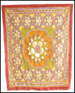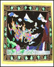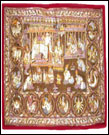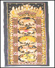 Padded embroidered tapestry with zodiac calendar. Made from plush velvet, linen, silk, and cotton then adorned with plain and metallic threads, metal sequins, beads and glass "stones.".